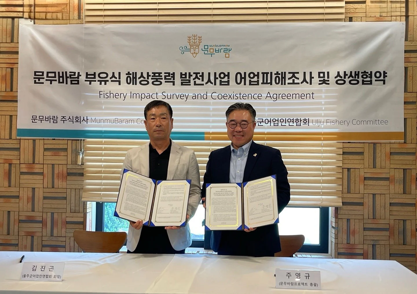 (July 23, 2025) MunmuBaram Co., Ltd. signed a Memorandum of Understanding (MoU) with the Ulju Fishery Committee (hereinafter ‘the Committee’) to enhance cooperation and carry out a fishery impact survey as part of its offshore wind project development.